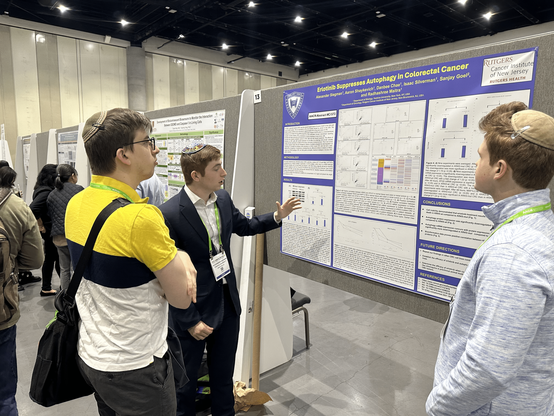 This was the fifth successive year that Dr. Maitra’s laboratory has published abstracts at the AACR, and this year, the students had the privilege of presenting their research with four posters. The posters presented were: Targeting intermediates of the PRMT5/BRG1 axis as a combination therapy and Carbamazepine mediated SMARCA4 inhibition as a therapeutic target for KRAS-mutated CRC, presented by Shaykevich; Erlotinib suppresses autophagy in colorectal cancer, presented by Siegman; and Molecular dynamic simulations of RAS family protein interactions: Mutant KRAS binding with wildtype HRAS and NRAS, presented by Silverman.